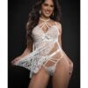Feel the desire in this sensual lace nightgown featuring sheer soft cups with a strappy chest, satin bow accents, adjustable spaghetti straps, a hook and eye back closure, a flyaway open skirt with high side slits, rhinestone charm accents, and a matching panty.FABRIC: 88% Polyamide 12% Spandex.Queen, Bust: 38in.-43in. Waist 30in.-35in. Hip: 40in.-45in. Size: 12-18.
