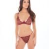 Unbelievably, alluring strappy bra set. Open triangle cups and halter neckline. Customize the fit with fully adjustable stretch straps. Crotchless strappy bottom, G-string not included. Stretch nylon straps. Fabric content body 75% Nylon, 25% Spandex. Ladies sizes medium to large, M/L. Bust 34 inches to 38 inches. Waist 26 inches to 30 inches. Hips 36 inches to 40 inches. Cups B/C. Dress sizes 10 and 12. From Rene Rofe lingerie.