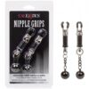 Tweezer-style nipple clamps give you the right amount of squeeze for an incredible nipple play experience. Adjust the tweezers to exactly the pressure you desire, and let the weights pull and tug for even more pleasure.2 multi-use clamps are included with your purchase. Play with both, or use just one at a time. These clamps allow you to play any way you desire. Plus, you can use them alone or with a partner.The fully adjustable tweezer-style clamp with sliding ring lets you control the pressure. Move the sliding ring up or down for a totally customizable pleasure experience. The fully-adjustable design also allows for use on all body types.Experience increased stimulation with the sensual weights. They look sexy while also providing added sensation. The weights gently tug, move and sway with the body. While you're playing, the Nipple Grips provide different sensations with every move you make.These clamps are made of heavy-duty metal that is non-tarnishing and nickel-free, making them body-safe and long-lasting. To keep your products clean, simply wash with warm soap and water or our CalExotics toy cleaner, and let dry.90 day warranty.