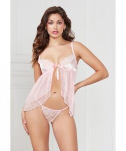 Satin Jacquard Dot Mesh Scallop Lace Babydoll & G-string Light Pink Md