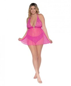 Simply Sexy Scalloped Stretch Lace & Mesh Halter T-back Babydoll Paradise Pink O/s