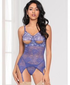 Cross Dye Lace Peek A Boo Chemise W/attached Garters & G-string Iris O/s