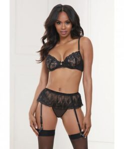 Valentine Embroidered Lace & Mesh Bra, Garter Skirt & G-string Black Xl