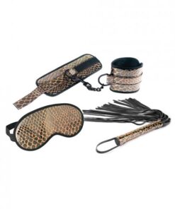 Spartacus Faux Leather Wrist Restraints Blindfold & Flogger Bondage Kit – Gold