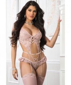 Garter Corset Teddy & Stockings Deep Rose O/s