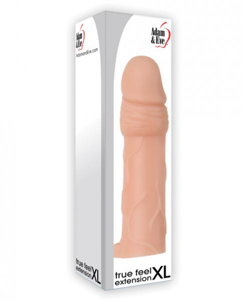 Make Your Strong, Hard Erection Even Better! Based on customer demand, here's our biggest penis extension ever! Enjoy a bigger penis feel and look when you slip the A&E True Feel Extension XL over your erect shaft. And the ball strap keeps it in place, stimulating your bad boys so you can play even longer! You'll both love the realistic shape and feel! Act out your wildest phallus fantasies in just moments. No assembly required, just apply a little lube to your hard shaft and slip it inside the A&E True Feel Extension XL. Once your balls go through the ball strap, you're good to go with a hefty 3.5" of length added to your erection — and now it'll be thicker, too! From Adam and Eve.