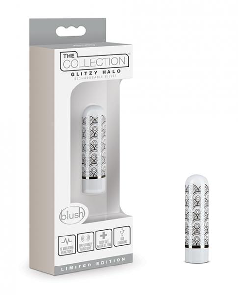 The Collection Glitzy Halo Bullet's strength will shine! Halo's shimmering silver accents bring style to your playtime. Discover 10 powerful vibration functions packed inside Glitzy Halo's compact body. Discreet, simple to store, and a perfect travel companion! Glitzy Halo is rechargeable, body safe, splashproof, and easy to clean.