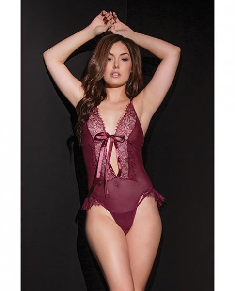Bold Mesh & Fine Lace Crotchless Teddy . Crotchless teddy. Frilly lace up hip detail. Center front ribbon ties. G-string and pasties NOT included. One size fits US Sizes 2-12.