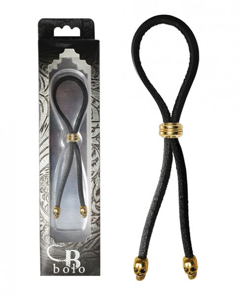 Bolo is a collection of men's erection enhancement devices. Extremely easy to put on and take off just like a lasso; Bolos are easily adjusted by simply sliding the decorative bead up or down. The black cord is made from high quality leather. This Bolo style features a golden slider and fantastic skull bead tips. One size fits most. Made in the USA