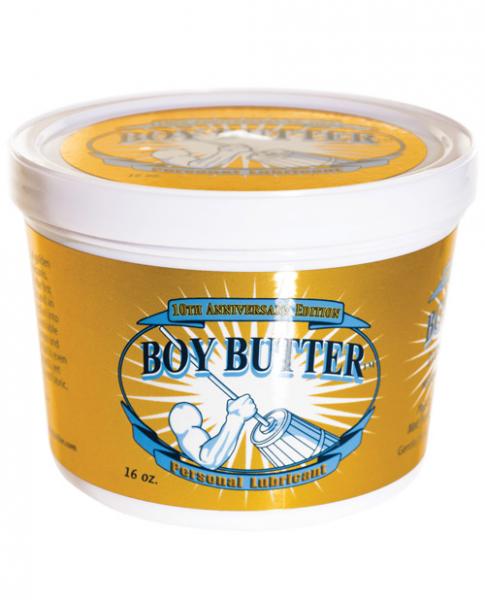 Boy Butter 10th Anniversary Edition is a special golden gift to the connoisseurs of fine personal lubricants. Back in 2003 Boy Butter Lubricants debuted the first oil based lubricants consisting of coconut oils and an organic silicone blend homogenized to perfection into the world's first totally water soluble and easily washable personal lubricant formula perfect for both men and women alike. Boy Butter looks like real butter but is even better, lasting as long as any synthetic or silicone lubricant yet washes off with water alone from both skin and fabric. Gentle, multipurpose and safe on all toys. Plus, a portion of the proceeds of Boy Butter Gold goes to global reforestation projects, so it is as green as it is gold. NOT Latex Condom Compatible – Can be used with Polyurethane Condoms like Durex Avanti and Trojan Supra. Ingredients: Partially Hydrogenated Vegetables Oils, Glycerin, Polysorbate 60,Tocoheryl Acetate, Glyceryl Stearate, Phenyl Trimethicone. 16 oz tub.