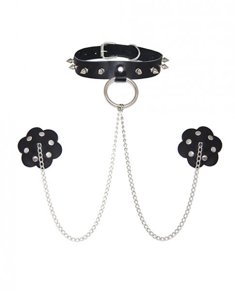 Burlesque Slave 4 U Chain Neck Choker Leather Reusable Silicone Nipztix – Black O/s