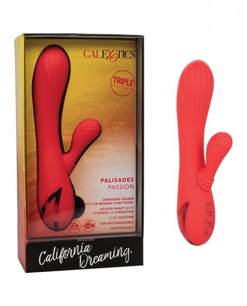 Give yourself over the your wildest fantasies and feel the heat rise with the red-hot California Dreaming® Palisades Passion. Experience pleasure like never before with the unique swinging teaser and 3 speeds of shaft vibrations. The luxurious heated rabbit vibrator has a one-of-a-kind side-to-side rhythmic stimulator for mind-blowing external stimulation. Whether you're looking to turn up the heat with a lover or just enjoy some sensual solo time, this ravishing heated massager is ready. The incredible warming massager reaches a maximum soothing temperature in just 3 minutes for an indulgent good time. The rhythmic side-to-side teaser functions deliver show-stopping clitoral stimulation while the contoured shaft indulges with deep rumbling vibrators. Control and customize your pleasure play with the independently controlled vibration and stimulator functions. Recharge the massager in 2.5 hours with the provided USB charging cable to enjoy 45 minutes of high-speed stimulation or 90 minutes of low speed vibrations. Enjoy frustration-free control with the easy-touch 3-button control pad and security lock feature for travel-ready teasing. The virtually seamless body and self-sealing charging port allow you to get this versatile waterproof vibe for a dip. The hypoallergenic premium silicone is body safe, unscented and phthalate free to keep you most sensitive spots, happy and healthy.