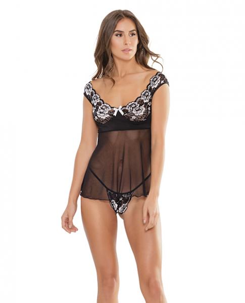 Classic Scallop Stretch Lace & Mesh Babydoll & G-string Black/white Sm