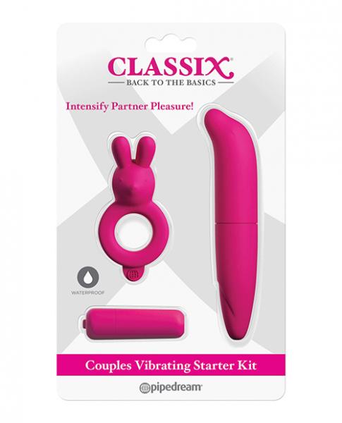 Turn your evening into a night of naughty fun with this Couples Vibrating Starter Kit! This pleasure kit is the perfect starter kit, and has everything you need to get your party started. The powerful mini bullet offers incredible pulsation directly to your most sensitive spots, while the cleverly curved G-Spot stimulator will hit just the right spot for the most explosive stimulation you've ever imagined. Prolong the fun and make pleasure last with the vibrating rabbit ring, easy one-button operation and whisper quiet vibrations will tease and please!Three Products Included! Mini Bullet, Vibrating Cock Ring, G-Spot Tickler .Easy One-Button Operation. Whisper Quiet Vibrations. Waterproof.
