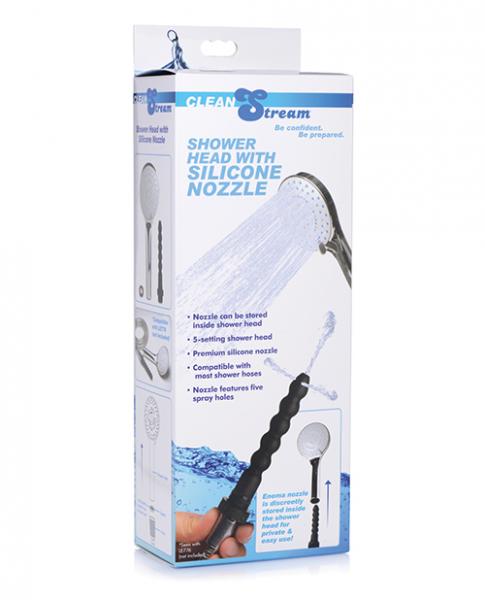 Store your enema tools in plain sight with this discreet shower head! The textured silicone nozzle is hidden away in the base of the shower head, made with premium silicone and the perfect size for a quick backdoor rinse while you shower. This combination shower head/ enema nozzle is perfect for those who need convenient access to their enema equipment but need to keep it hidden.The shower head itself is built with 5 different shower settings for a variety of textures. The silicone nozzle features 5 spray holes for an effective clean! The nozzle is made with premium, plush, phthalate free silicone for a comfortable and worry free insertion. Compatible with water based lubes only.This kit includes one gasket for a secure fit on most shower systems. Use this Showerhead enema in conjunction with the Cleanstream Shower Enema System (SKU: LE776) for a wide variety of enema options in the comfort of your own bathroom!Measurements: Showerhead overall length 8.6 inches, nozzle overall length 5 inches, insertable length 4 inches, widest insertable diameter 0.7 inches, thread diameter 0.75 inches.Materials: Silicone, ABS Plastic.