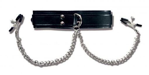 The Sportsheets Collar with Nipple Clamps. Gorgeous, vegan leather collar with attached nipple clamps provides constant stimulation. Soft, double-layered, hand-stitched, PVC collar adjusts with a quality, roller buckle closure. The two coated nipple clamps have tension adjustments and are attached to the collar with 10.5" chains. Perfect for nipple stimulation and many other sensitive areas. Nickel-free.