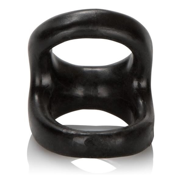 Stretchy and comfortable dual enhancer ring. Built-in scrotum support. Thermoplastic Rubber TPR. 1 inch penis ring, 1.25 inches scrotum ring, 2 inches by 2.25 inches overall. From California Exotic Novelties.