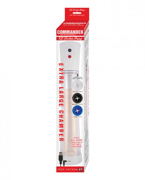 Commander XL Electric Pump from Nasstoys.High vacuum electric pump.3 sleeve sizes for a snug fit.Extra large chamber.Waterproof.Phthalates freeMaterials: silicone, AS, ABS, PVCPump size: Length – 13.375?, Diameter – 2.75?, Circumference – 8.75?Three sleeve sizes: (internal diameter of opening), Small – 1.125?, Medium – 1.375?, Large – 1.5?USB Rechargeable.Charging time: Up to 1 hr.Use time: 1 hr.