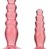 Explore your backdoor with confidence! With a small and medium plug, the Doc Johnson Crystal Jellies Anal Trainer Kit is the perfect fit for anal play beginners. The small plug is 3.5" with 3.75" insertable length, the large plug is 4.25" diameter with 4.75" insertable length. These plugs feature a wide flared base for safe and comfortable anal play. Crystal Jellies are made from non-phthalate body safe material, which includes Doc's antibacterial Sil-A-Gel formula. Proudly made in America. 2-piece anal trainer kit. Best-selling Crystal Jellies material. Ribbed Shafts. Flared base for safe anal play.