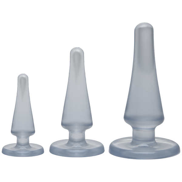The Crystal Jellies Anal Initiation Kit allows beginners to ease into backdoor play while enjoying each stage of intensity and fullness. Three classic plugs in smooth, body-safe material sized at one-inch intervals offer progressive levels of sensation, while flared bases and a firm yet flexible feel ensure safe and versatile fun. Experienced backdoor enthusiasts can also enjoy this set as the warm-up for a night of more extreme intimate exploration. Color Clear. From Doc Johnson.