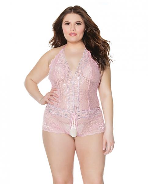 Crystal Pink Halter Crotchless Teddy .Halter adjustable straps. Front ribbon lace up and bow.Back elastic lace up.Silver hardware. G-string not included. Metallic Shimmer Stretch Lace/ Stretch Lace. OS/XL. Weight: 170lb – 200lb. Bust: 40in. – 48in. Waist: 32in. – 40in. Hip: 42in. – 50in. Cup: C/D. Dress: 14-20.
