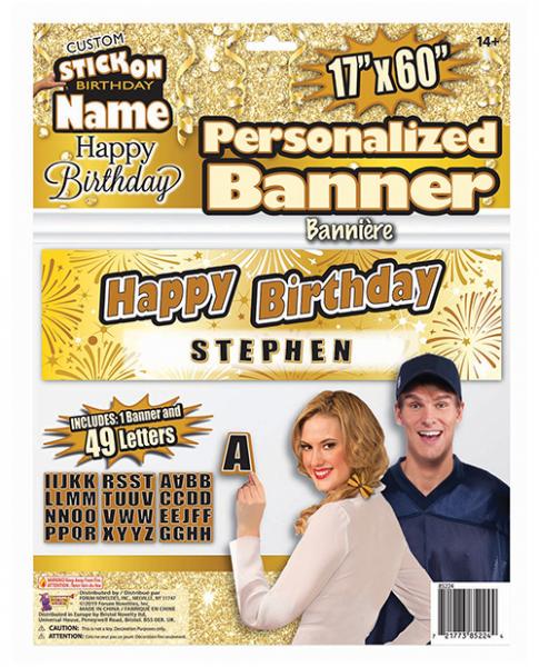 Custom stick on name Happy Birthday Banner. 17 inches by 60 inches. Includes one banner and 49 letters. From Forum Novelties.