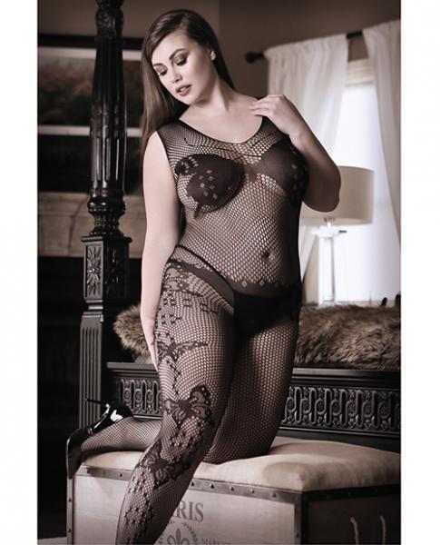 Dark Monarch Butterfly Knit Bodystocking from Fantasy Lingerie Sheer Fantasy line. Butterfly knit bodystocking with open crotch panel. Panty not included. Fabric content 90% Nylon, 10% Spandex. Washing instructions: hand wash separately in cold water. Do not bleach. Flat dry. Sizing information sizes 14 to 18. Bust 42 inches to 46 inches. Hips 42 inches to 49 inches.
