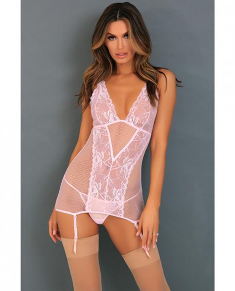 Wow you lover in this lace and fishnet chemise set. Hook and eye back closure and adjustable strap straps allow for a perfect fit. G-string panty included. Please note thigh high stockings, not included. Sold separately. <br /><br />Color Pink. Ladies sizes medium to large, M/L. Bust 34 inches to 38 inches. Waist 26 inches to 30 inches. Hips 36 inches to 40 inches. Cups B/C. Dress sizes 10 and 12.