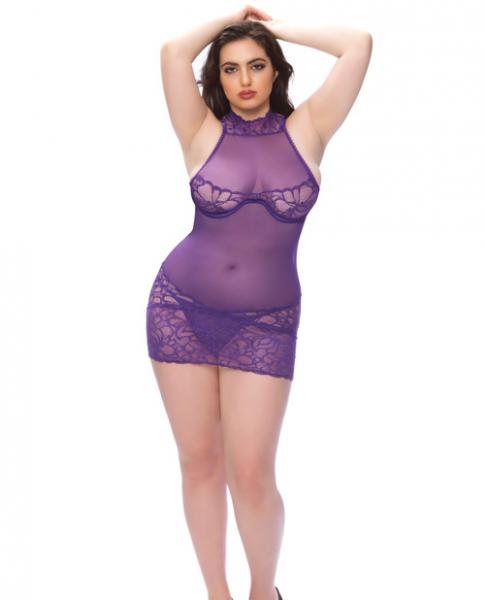 <div>This flirty purple chemise set features a high lace neck, a sheer mesh neckline, sheer lace underwire cups, adjustable spaghetti straps, a hook and eye back closure, a sheer mesh and lace bodice, an open back panel, and a matching panty. Color Grape, Purple. Ladies plus size 2X. Cups D/DD. Bust 42 inches to 44 inches. Waist 36 inches to 40 inches. Hips 46 inches to 50 inches. Weight 190 pounds to 220 pounds.</div>