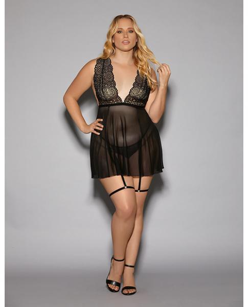 Euphoria Babydoll with Attached Leg Garters. From Escante.Queen. Size: 16-20. Cup: D/DD. Bust: 40in.-54in. Waist: 34in.-44in. Hip: 42in.-56in. Weight: 165-275lbs.