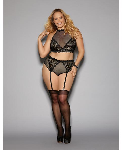 Euphoria Bra Set with Detachable Garters & Hose. From Escante.Queen. Size: 16-20. Cup: D/DD. Bust: 40in.-54in. Waist: 34in.-44in. Hip: 42in.-56in. Weight: 165-275lbs.