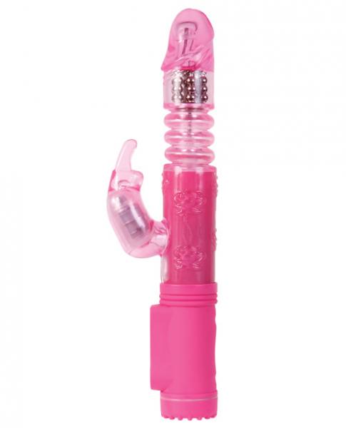 Eve's First Thruster Vibrator features a realistic shaft that thrusts up and down just like A lover. 6 speeds of thrusting power. Beads inside shaft rotate to stimulate G-Spot. Two rotation settings: clockwise, counter clockwise. Soft vibrating bunny and ears tickle the clitoris. 12 bunny vibration functions. Clean up is easy with toy cleaner and warm water rinse. Waterproof vibrations. Material Thermoplastic Rubber TPR. Color Pink. Dimensions 9.75 inches long, 5.5 inches insertion length, 1.25 inches wide. Vibrator requires 4 AAA Batteries, not included. 5 year warranty.
