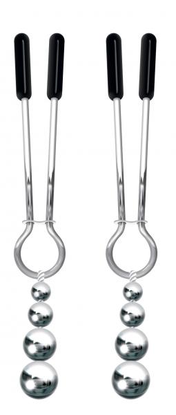 Let your naughty fantasies run wild in Eve's Naughty Nipple Clamps. Made from silvery metal, these clamps put a sexy pinch on your love buds. Elegant beaded weights swing from each clamp, tugging lightly with your every move. The best part? They are adjustable via easy to use sliders, so you can indulge in a little or a lot of nipple stimulating excitement. 3.45 inches total length, 2.25 inches long clamp, .45 inch wide.