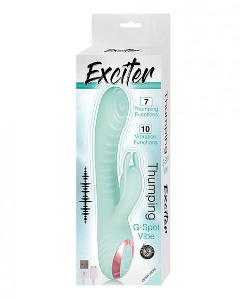 Exciter Thumping G Spot Vibe. 7 thumping functions. 10 vibration functions. Waterproof. Phthalates freeMaterials: Silicone / ABSSize: Length – 9?, Insertable length – 5?, Width – 1.25?Rechargeable: Charging time = 2.5 hrs., Working time = 50 mins.