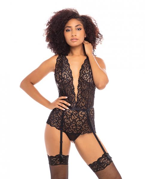 Pleasure loving Maxine knows exactly how to command a room. Designed with a dramatic deep plunging neckline, lace accentuates your curves in all the right places before graduating down into four adjustable garter straps.Soft cup galloon lace body with front mesh panel. Attached garter straps .Adjustable shoulder and garter straps. Crotchless and open back.One Size :Cup B/C, Bust 32in.-38in., Waist 24in.-32in., Hips 34in.-40in., Weight 90-160 lbs.