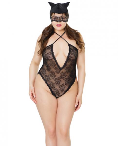 Kitty teddy and mask with criss cross neck detail and cutout back detail from Coquette International lingerie line. Color Black. Ladies plus size, OS/XL. Weight 170 pounds to 200 pounds. Bust 40 inches to 48 inches. Waist 32 inches to 40 inches. Hips 42 inches to 50 inches. Cups C/D. Dress sizes 14 to 20.