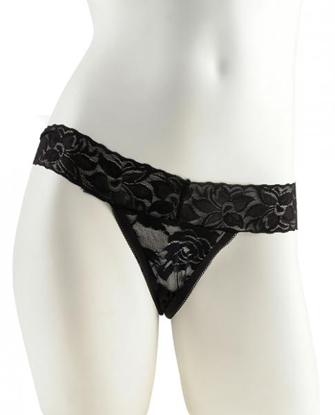 Can you keep a secret? Tucked away discreetly inside this sexy, low rise lace thong is a hidden micro bullet designed to rock your world! The soft, stretchy waistband is so comfortable, you will forget you are even wearing panties, until you turn on the secret micro stimulator.<br /><br /> With the push of a button, the whisper quiet motor comes to life and provides direct stimulation where you want it most. Best of all, no one will ever know why you are smiling so much! Fits waist sizes 34 inches to 44 inches. Material fabric content Nylon, Spandex. Bullet vibrator battery information 3 LR44/AG13 1.5V, included.