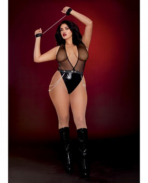 Wet look faux-leather and stretch fishnet deep plunge halter teddy.Grommet detailed elastic waistband with adjustable back. Adjustable G-String. Dangling silver chain details. Silver chain wrist restraints included.Selling of the Dreamgirl collection online through any 3rd party portal is prohibited. All sales of Dreamgirl collection must occur through the retailer's own e-commerce site or physical store. This restriction includes sales through online marketplaces (such as Amazon) and internet auction sites (such as eBay).Queen. Size: 16-20. Cup: D/DD. Bust: 40in.-54in. Waist: 36in.-44in. Hip: 42in.-56in. Inseam: 36.5in. Rise: 9in.-9.5in. Weight: 165-275lbs.