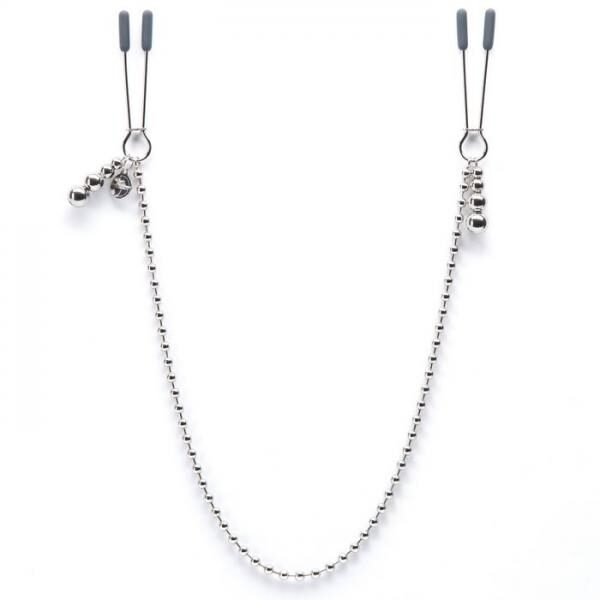 Adjustable nipple clamps fitted on a beaded chain. Clamps gentle pinch offers teasing pleasure, while the chain can be tugged for added stimulation during play. Nickel free metal clamps and chain with silicone tipped clamps for cushioning comfort. Designed for couples. Comes with a satin storage bag. From Lovehoney.