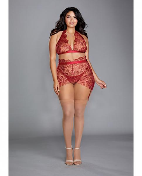 <p>Halter Bralette with Floral Embroidery pattern. Matching Garter Skirt and G-String included. Color- Red. 1X Cup: D/DD. Bust: 40in.-44in. Waist: 36in.-38in. Hip: 42in.-44in. Selling of the Dreamgirl collection online through any 3rd party portal is prohibited. All sales of Dreamgirl collection must occur through the retailer's own e-commerce site or physical store. This restriction includes sales through online marketplaces (such as Amazon) and internet auction sites (such as eBay). All DG BRANDS catalog products are subject to MAP (Minimum Advertised Price) agreement.</p>