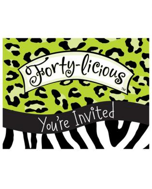Forty-licious Invitation Diecut Gatefold from Creative Converting. The party guests will be delighted to receive these invitations to the celebration for the special 40 year old. The diecut gatefold invites match the Forty-licious theme design in bright lime greens and black leopard spots stamped above the wavy black and white zebra stripes. Printed across the front is You're Invited. Friends will hurry to open the invite and plan for the wild day. 8 count.
