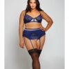 Keep the night going in this tantalizing bra set featuring molded underwire cups with a lace overlay, contrast piping, a satin bow accent, adjustable spaghetti straps with a picot trim, a hook and eye back closure, a matching waist cincher, adjustable garter straps, and a matching g-string panty. (Thigh highs not included.) FABRIC: 90% Nylon, 10% Spandex. Large. Size: 10-14. Bust: 36in.-38in. Waist: 29in.-31in. Hip: 38in.-40in.