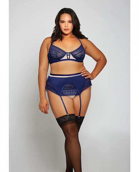 Love will be in the air in this breathtaking bra set featuring underwire soft cups with a scalloped lace overlay and a contrast underbust, spaghetti straps with a hook and eye back closure, a matching waist cincher, adjustable garter straps, and matching g-string panty. (Thigh highs not included.) FABRIC: 90% Polyester, 10% Spandex. 1X. Size: 16-18. Bust: 40in.-44in. Waist: 35in.-37.5in. Hip: 43in.-46in.