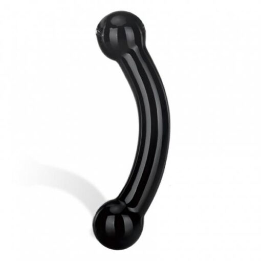 Glas Double Bull Black Dildo. Behold the sleek, sensual beauty of black glass. This double-header features bulbous balls at both ends for deep personal pleasure or erotic couples play. Features: fracture resistant, hypoallergenic. Easy to clean. Retains heat and cold for increased stimulation. Compatible with all lubricants.