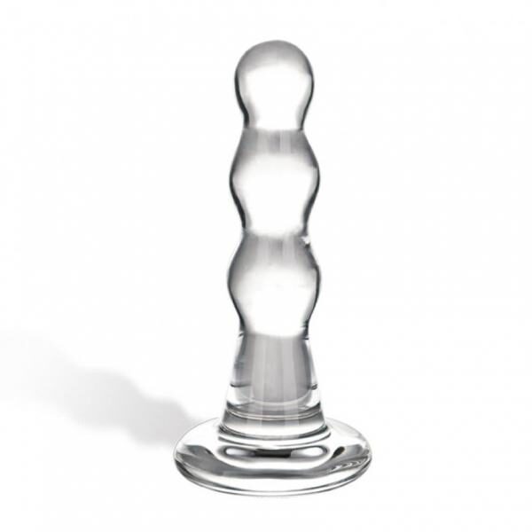 Glas Triple Play Beaded Butt Plug. The classic beaded butt plug in high-quality tempered glass. Features wide base for safe anal play. Features: fracture resistant, hypoallergenic. Easy to clean. Retains heat and cold for increased stimulation, Compatible with all lubricants.4" length, 3.5" insertion length by .72" at tip, 1" widest insertable 2" inches Base.