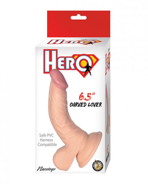 Hero Curved Lover. Harness compatible.Strong suction cup base. Flexible and feels real.Waterproof.Material: PVC.Size: Dong length / height: 6.5”, Insertable Length: 5.5”, Width: 1.75”, Circumference: 5”.