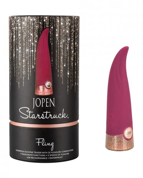 Give yourself over to a sensual love affair with the flexible Jopen® Starstruck Fling. This sensually designed massager thrills with a flickering tip, flexible body and 35 functions of vibration.Dial in to exactly what you desire with the sensually curved vibes incredible 7 pulsation, vibration and escalation functions and 5 independent speeds for every functions. Flicker to your favorite setting with the easy-touch control buttons for frustration free control.The curved massager has been created to flex and move with your body while the flickering tip tickles your most sensual curves. The supple silicone and dazzling glitter base make this vibrator a stylish addition to any pleasure toy box.Get playful with up to 1 hour of passionate pleasure with every charge. Use the provided USB charger to recharge your passion in only 2 hours. The slim size and travel lock button feature make this handheld massager the perfect travel companion and let you embrace knee-shaking pleasure wherever your fantasies take you.One Year Warranty.