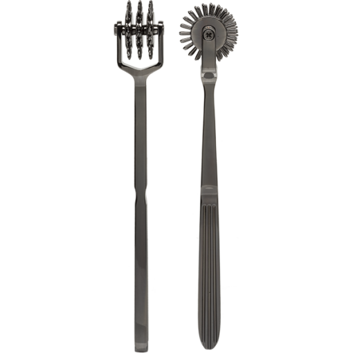 Kink 3 Wheel Pinwheel. Stimulating Pinwheel with three rollers. perfect for medical fetish or general sensation play. User controls pressure and effects. Black chrome finish metal. Individual wheel tracks prevent pinching. Extra long handle suits every user. Width 1 inches. Length 7 inches.