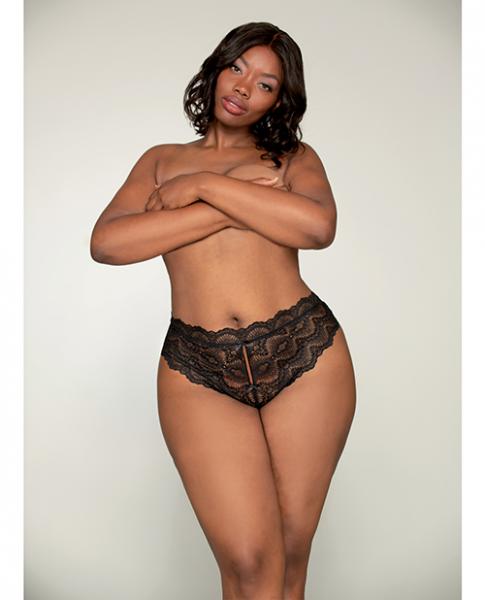 Lace tanga open-crotch panty with elastic open back detail. 3X. Cup DD Bust 48in.-52in. Waist 40in.-42in. Hip 50in.-52in.