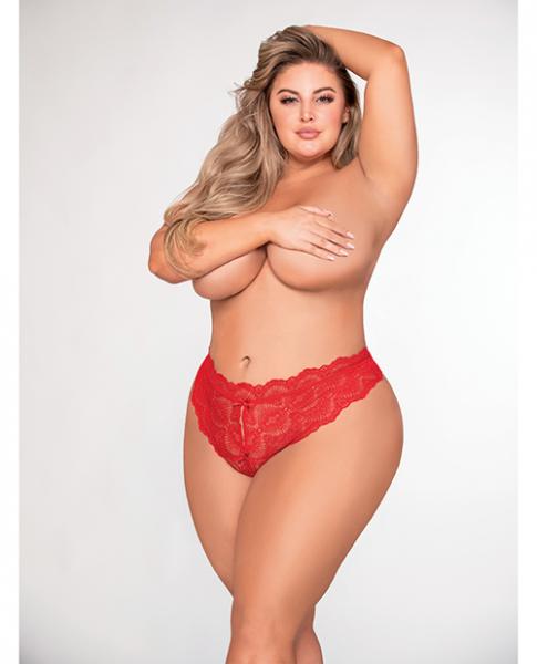 Lace tanga open-crotch panty with elastic open back detail. 1X Cup: D/DD. Bust: 40in.-44in. Waist: 36in.-38in. Hip: 42in.-44in.